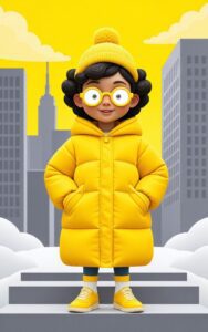 Cheerful kid in yellow winter outfit stands happily between city buildings.#BrightMood