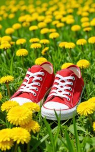 Vibrant red sneakers placed beautifully among bright yellow dandelion flowers.