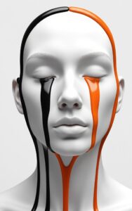 Minimal white face dripping bold black and orange flowing paint.
