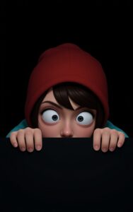 Wide-eyed girl cautiously peeks from behind darkness with nervous expression.