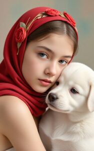 Soft-hearted girl lovingly cuddles her adorable white puppy companion.#PureBond