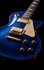 Metallic blue guitar glows beautifully with premium golden hardware finishing.