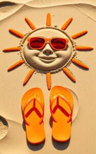Smiling sun with glasses pairs perfectly with bright orange flip-flops.#BeachMood