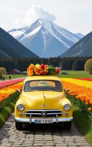 Vintage yellow car drives through vibrant tulip valley beneath mountains.