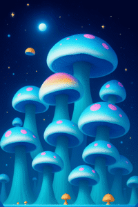 Tall glowing mushrooms rise beneath dreamy starlit galaxy skies. #Fantasy