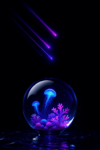 Glowing jellyfish drift inside glass orb of neon wonder. #SciFi