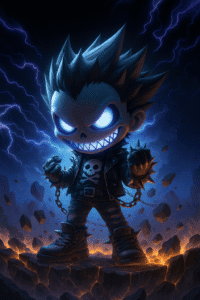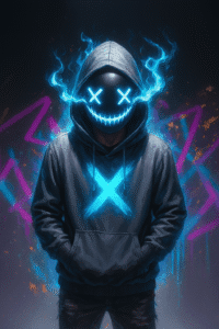 A mysterious figure with blue electric mask radiating dark energy. #CyberVibe