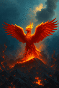 Fiery phoenix spreads wings, reborn from molten volcanic fire. #Legend