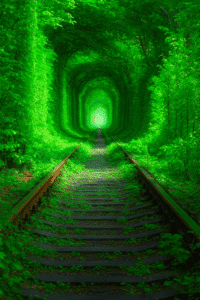 Endless green rail path glowing through living tunnel of hope. #Nature
