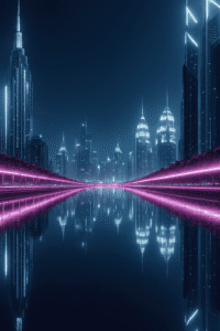 A neon-lit futuristic city mirrors perfectly across calm water. #Futuristic