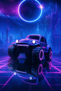 A glowing monster car stands beneath a neon cyber eclipse. #RetroWave