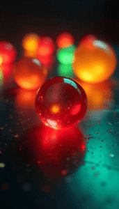 Vibrant luminous spheres reflecting colorful lights in dreamy darkness. #Aesthetic