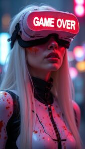 Futuristic woman wearing glowing headset stands under neon city lights. #Cyberpunk