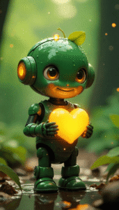 Cute green robot holding glowing heart symbolizes nature and hope. #EcoBot