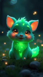 Adorable neon creature shines bright amidst glowing forest fireflies. #Fantasy