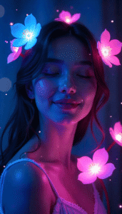 Serene woman surrounded by radiant pink and blue glowing flowers. #GlowArt