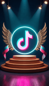 Illuminated TikTok emblem with angelic wings under stage spotlight. #DigitalVibe
