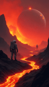 Explorers walk across molten rivers beneath a fiery alien sky. #SciFi