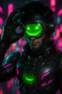 Intense glowing green eyes stare fiercely with electrifying futuristic energy.