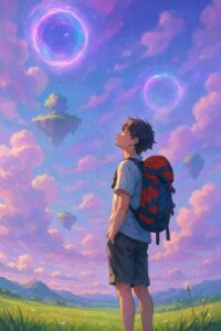 Young dreamer gazes upward toward glowing rings in floating skies.#SkyDreamer