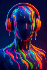 Vibrant neon paint drips dramatically across faceless headphone figure.