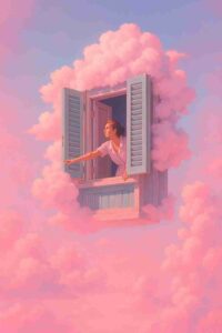 She leans out dreaming through magical floating window surrounded by clouds.#CloudEscape