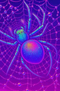 Colorful neon spider rests proudly on shimmering glowing cosmic web.#NeonSpider