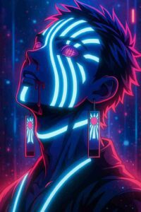 Glowing neon markings illuminate his fierce expression under cyber night. #NeonWarrior