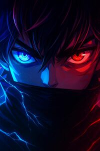 Anime warrior stares fiercely with electric blue and fiery red eyes.