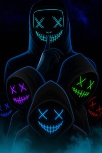 Hooded neon mask squad standing silently with mysterious glowing expressions. #NeonShadows