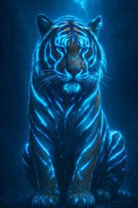 Glowing blue-striped tiger stands powerful under stormy mystical atmosphere.