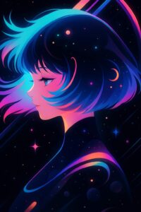 Cosmic neon shades swirl around dreamy anime girl’s serene profile.