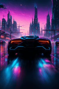 Futuristic neon car racing fast through glowing cyberpunk city.” #NeoCity