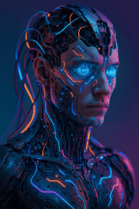 “Futuristic cyborg glowing with circuits, embodying advanced human technology.” #TechSoul
