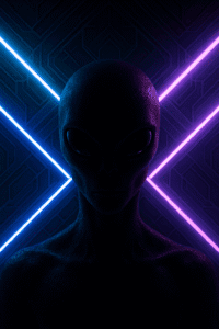 “Mysterious alien figure stands under glowing neon light cross.” #AlienVibe