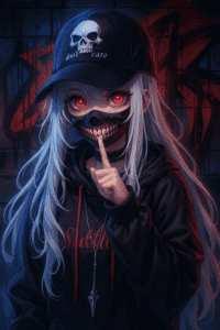 Anime girl with red eyes and sinister skull mask.” #DarkAnime