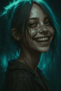 Freckled girl smiling brightly with glowing mysterious green aura.” #MysticSmile