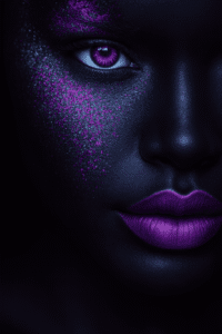 “Glowing purple eyes and lips shining with cosmic elegance.” #PurpleAura