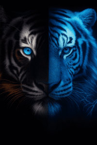 Dual-faced tiger glowing with fire and icy power.” #BeastMode