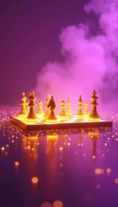 Golden chess pieces glowing brightly under mysterious purple smoke.” #ChessGlow