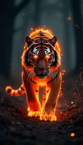 Fiery tiger walking fiercely with glowing eyes in darkness.” #FireBeast
