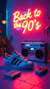 Retro vibes with sneakers, cassettes, and neon 90’s glow.” #RetroVibes