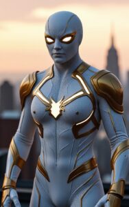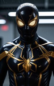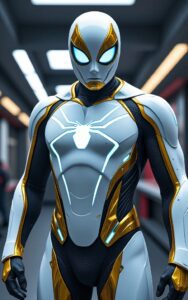 Advanced spider suit glowing with futuristic golden energy power. #FutureSpider