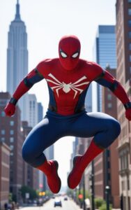 Spider hero leaps forward ready for rooftop battle. #SkySpider