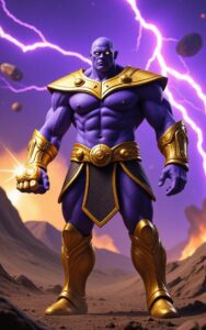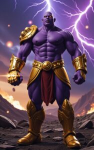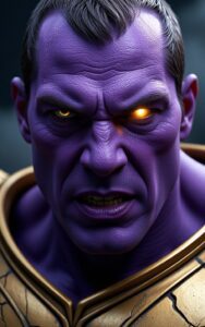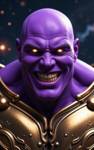 spiderman wallpaper 4k:Evil purple titan smiling fiercely, glowing eyes, unstoppable cosmic dark power unleashed.