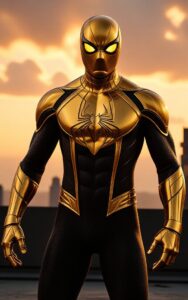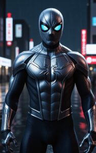 High-tech armored spider suit glowing bright, futuristic night protector stands strong.