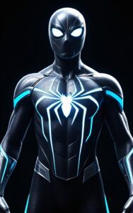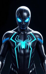 Neon cyber spider suit glowing bright, futuristic strength and advanced agility.#CyberSpider π