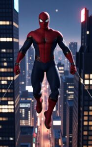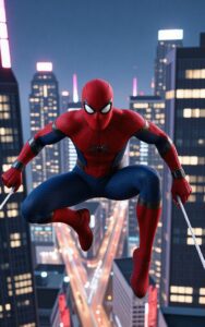 Heroic Spider-Man swinging high above city lights, night action unstoppable.