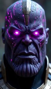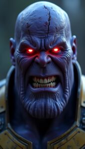 Furious Thanos with red glowing eyes, showcasing raw cosmic anger and ultimate destruction.
