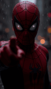 Spiderman in the rain, pointing forward with determination, embodying justice and resilience.